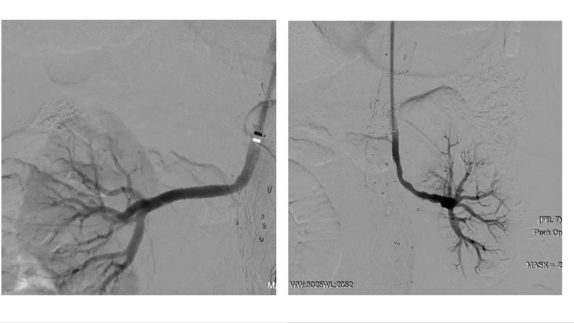 (右肾开口处重度狭窄,左肾烟囱支架术后增加了手术难度)